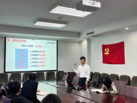 教务处处长刘志军同志作了“学习贯彻二十大精神 着力培养拔尖创新人才”的主题党课。结合党的二十大报告内容,从“深刻领会党的二十大报告对教育工作的战略部署和核心要义、在一流本科建设加速跑过程中贯彻落实党的二十大报告精神、以党的二十大精神为指引全面提高人才自主培养质量”等方面,对今后如何全面提高人才自主培养质量、培养拔尖创新人才等问题进行了思考,并提出从落实立德树人根本任务、完善“大思政课”工作体系、全面深入推进党的二十大精神进教材进课堂进头脑、推进一流本科人才培养等方面落实党的二十大精神。