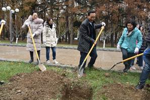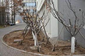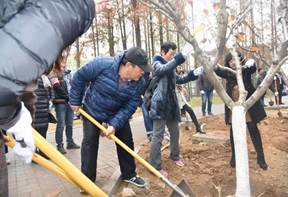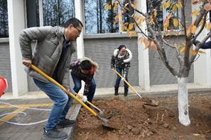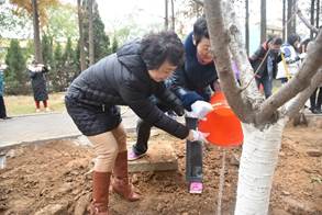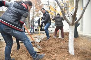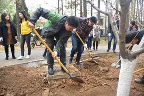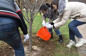 经过前期与校园规划与管理办公室的沟通协调,提前完成了选址、选树等准备工作。活动当天,两个支部全体党员一起动手,挖坑、栽种、填土、浇水……共同在伯川图书馆南门周围种下5棵樱花和3棵木槿,行成了支部的“党建林”,也寓意着图书馆和图书馆党支部的未来生机勃勃、充满绿色希望。