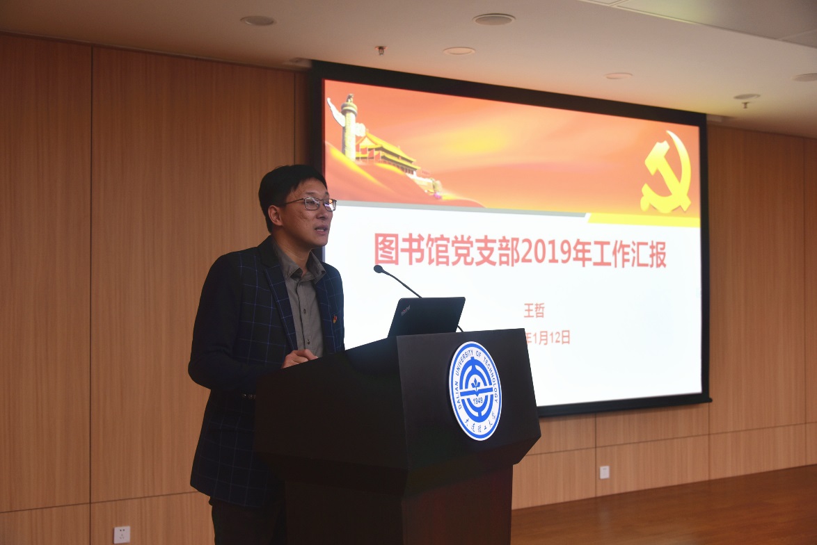 党支部书记王哲首先代表支部班子就支部2019年工作进行总结汇报。他介绍了支部总体概况,并从组织生活、特色工作、作风建设、荣誉肯定几个方面,对2019年图书馆党支部工作进行了全面的梳理和总结,并对2020年工作进行了规划和展望。王哲表示,2019年对图书馆和图书馆党支部来说是不平凡的一年,这一年,图书馆及支部各项工作面临着前所未有的困难和挑战:伯川图书馆回迁、举办三次全国性会议、迎接新中国成立70周年和建校70周年、开展“不忘初心、牢记使命”主题教育…… 全馆党员群众分工合作、通力配合、日夜坚守,不仅出色的完成了各项党建工作,也圆满完成各项急难险重工作,展示了大工图书馆过硬的素质和良好的形象,扩大了图书馆和学校的影响力。2020年,图书馆党支部将继续探索基层党建工作内涵,拓宽基层党建工作外延,做好新时代基层党建工作,促进图书馆中心工作再上新高度。