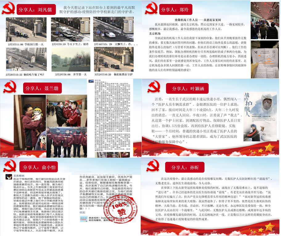 本次会上选取了部分党员代表与大家共同分享战“疫”中的感动。郑玲同志分享了从德国回国过程的亲身感受,向辛勤工作在一线,为无数归家旅客带来暖心、耐心、周到服务的机场工作人员致敬,同时也感叹祖国的强大和作为中国人的感动和自豪;刘凡儒同志分享了自学校校门封闭近两个月来,她站在阳台上记录下的疫情防控中学校新北门的守护者,无论刮风下雪,他们坚守一线,守卫着学校的安全与安宁,感受到了身边最平凡的默默守护的感动;聂兰渤同志分享了朋友圈一名大连援鄂男护士,舍小家,远离父母妻子和一岁的女儿毅然奔赴一线,临行前800字的朋友圈道尽了对亲人的不舍和作为一名党员奔赴一线的决心,感动了无数人;叶颖涵、俞小怡、孙昕等党员同志也分别分享了令自己感动的战“疫”故事,这些故事中有愿冒险为武汉医护人员撑起红勤保障工作的普通的快递小哥,有疫情中纷纷递交“请战书”的老党员和退休医生,也有身边愿为医护人员子女在线辅导的附校校长……