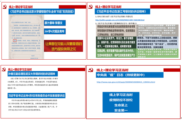 随后,王春鹏同志通过前期的学习,按照时间轴线,带领全体党员同志集体学习了3月15日习近平总书记给北京大学援鄂医疗队全体“90后”党员回信精神,3月29日至4月1日习近平总书记在浙江考察时的讲话精神,4月6日孙春兰副总理在武汉大学调研时的讲话精神,4月8日中共中央总书记习近平主持会议并发表重要讲话精神。