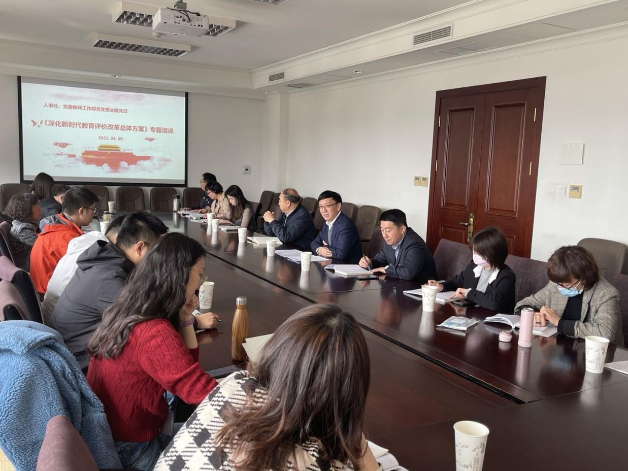 按照学校党史学习教育实施方案的部署和机关党委的要求,结合部门工作实际,4月9日上午,人事处(党委教师工作部)党支部于主楼512召开党员大会暨主题党日活动。    党委常委、副校长毕明树就中共中央、国务院印发的《深化新时代教育评价改革总体方案》(以下简称《总体方案》)进行专题培训,史志编研室主任、档案馆副馆长杨春平主讲党史学习教育专题党课《学习四史 继往开来》。支部全体党员、预备党员、积极分子参加,党日活动由党支部副书记张平媛主持。