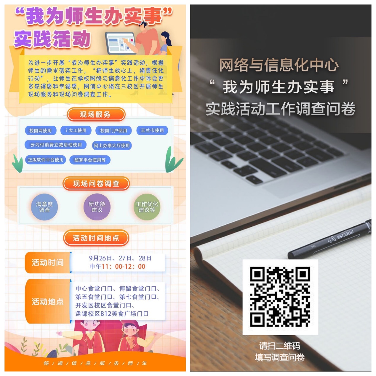 为进一步提升“我为师生办实事”实践活动的针对性和有效性,更好地了解师生在网络与信息化等方面遇到的热点、难点、痛点问题, 9月26日至28日中午,网信中心全体人员及开发区校区和盘锦校区的相关工作人员分别在各校区开展了现场服务和问卷调查活动。
