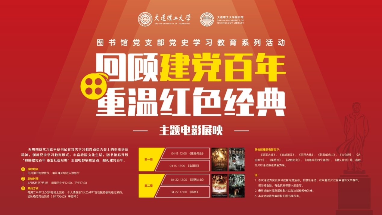 4月15日至7月1日期间,图书馆将于每周四午间、晚间在伯川图书馆报告厅放映红色经典影片,重温峥嵘岁月,献礼建党百年。